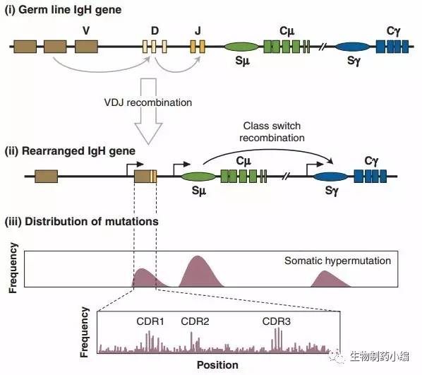 BCR基因重排后的成熟B細胞受到抗原刺激后,會于生發(fā)中心發(fā)生重鏈和輕鏈V區(qū)的高頻率突變(主要是點突變),之后再經(jīng)過FDC捕獲抗原使表達高親和力BCR的B細胞免于凋亡。這一過程使得后代B細胞的BCR對抗原的平均親和力得到提升。這樣的體細胞高頻突變屬于二次免疫應答,幫助可有效識別抗原的抗體進一步成熟,有助于機體有效抵抗外來抗原的再次入侵。