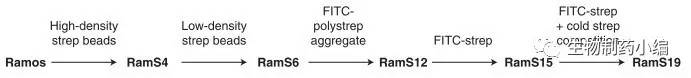 Ramos是來源于人Burkitt淋巴瘤的一株細胞系,在培養(yǎng)過程中其重排后的免疫球蛋白V區(qū)基因持續(xù)發(fā)生組成型突變,并表達到膜表面。早在2002年Sarah等人就報道了利用Ramos細胞系篩選出對鏈霉親和素有高親和力的IgM[2]。他們將鏈霉親和素結合到磁珠上,從一群Ramos細胞中篩出對鏈霉親和素有低親和力的細胞群,之后降低磁珠上的鏈霉親和素的密度以提高篩選的苛刻程度,進一步篩出親和力更高的突變。之后又進一步用標記FITC熒光的鏈霉親和素結合流式分選將抗體親和力進一步提高。