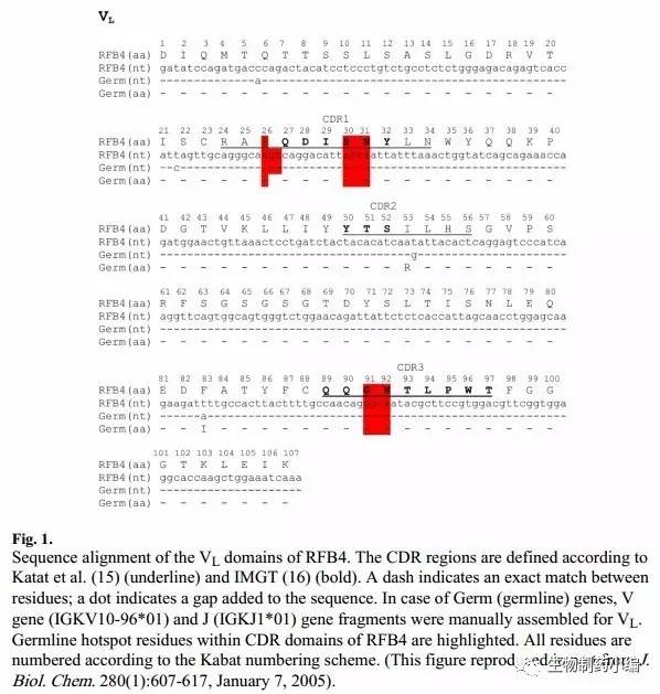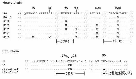 隨后,他們對各批次的亞克隆細胞的V區(qū)基因做了序列比對,找出了突變位點,分析了抗體與靶點之間的構效關系: