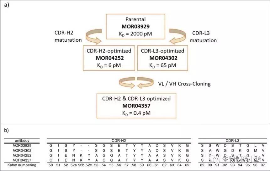 MorphoSys AG2016年發(fā)的文章[4]介紹了他們提高其自身的抗人GM-CSF抗體MOR103的親和力的工作。他們在知悉該抗體與抗原的結合方式后,對抗體的CDR-H2和CDR-L3分別做隨機突變,并用噬菌體展示的方法篩選到高親和力的序列,之后再把篩到的重鏈與輕鏈配對,得到一個新的“cross-cloned”抗體: