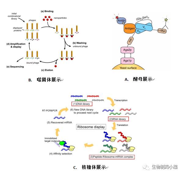 基于庫的抗體親和力成熟與基于庫的抗體初步篩選涉及的方法基本相同,主要是利用噬菌體展示、酵母展示、核糖體展示等系統(tǒng)。