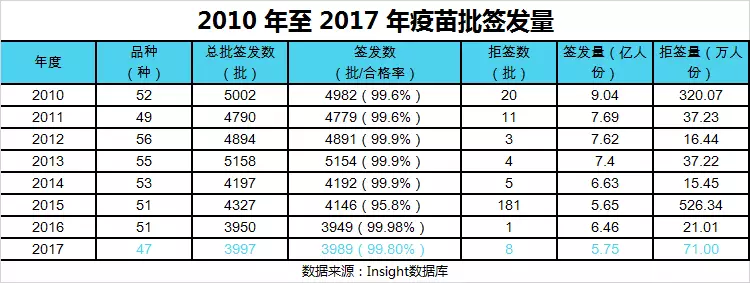 在中檢院和 7 家授權承擔生物制品批簽發的省級藥品檢驗機構(北京、上海、廣東、四川、湖北、甘肅和吉林)推進下,2017 年,我國共簽發了 3997 批,共計 5.76 億份疫苗,涉及到 119 家企業的 47 個疫苗品種。