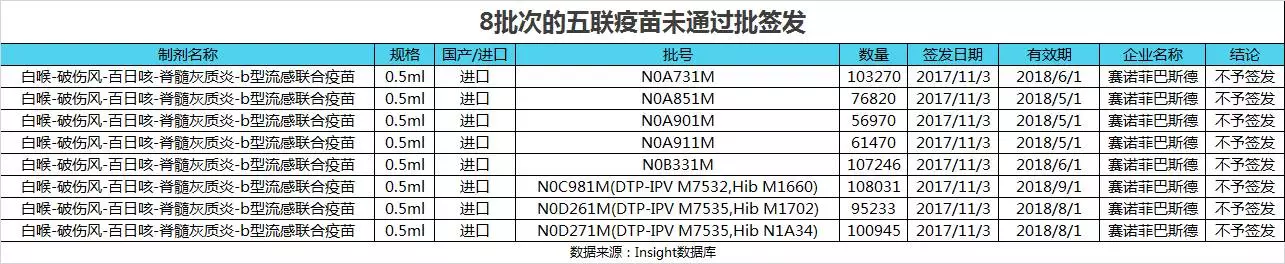 今年 11 月 3 號,8 批次的由賽諾菲巴斯德公司生產的第二類疫苗五聯疫苗(白喉-破傷風-百日咳-脊髓灰質炎-b 型流感聯合疫苗)未通過中檢所的批簽發檢驗,共計 709,985 的疫苗在發向市場的最后一步上被攔截,這直接導致了該疫苗供應鏈的中斷,國內多地出現五聯疫苗緊缺。