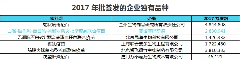 在今年新簽發的品種中,與五聯疫苗類似的獨家品種還有以下 5 個(占到今年簽發的 47 個品種的 10%),如蘭州生物的輪狀病毒疫苗、民海生物的無細胞百白破 b 型流感嗜血桿菌聯合疫苗。