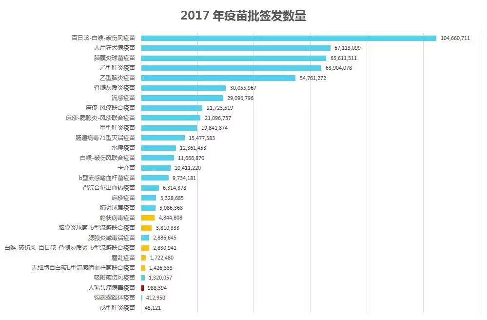 在今年簽發的 47 個疫苗品種中,百白破三聯疫苗簽發數量最多為最多,共簽發了 1 億份,占到今年疫苗簽發總量的 17.54%。