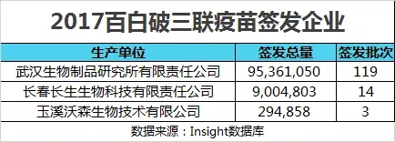 而今年百白破三聯疫苗簽發的為武漢生物制品研究所、長春長生生物科技有限責任公司和玉溪沃森生物技術有限公司 3 家公司,各企業簽發總量如下圖所示。