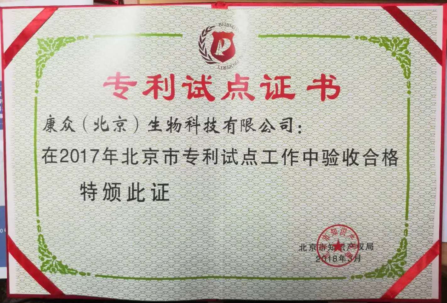 今年的4月26日是第18個(gè)世界知識(shí)產(chǎn)權(quán)日。至此宣傳周之際,康眾生物又迎來今年的另一項(xiàng)殊榮---北京市專利試點(diǎn)單位。根據(jù)《北京市企事業(yè)單位專利試點(diǎn)工作管理辦法(修訂稿)》的要求和北京市專利試點(diǎn)工作的總體安排組織和開展的。根據(jù)工作安排,北京市知識(shí)產(chǎn)權(quán)局對參加2017年北京市專利試點(diǎn)工作的企事業(yè)單位進(jìn)行了一年的試點(diǎn)培育工作,并與各區(qū)知識(shí)產(chǎn)權(quán)局、市經(jīng)濟(jì)技術(shù)開發(fā)區(qū)知識(shí)產(chǎn)權(quán)局共同對有關(guān)企事業(yè)單位進(jìn)行了專利試點(diǎn)考核驗(yàn)收工作。